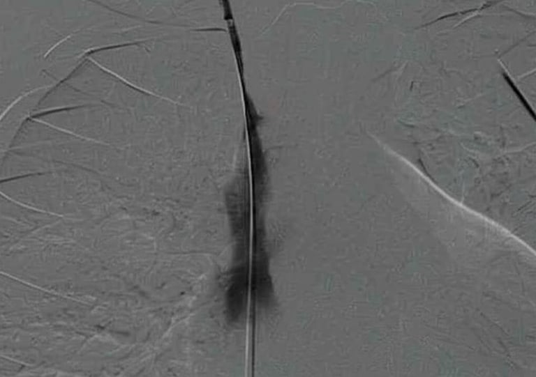 En presencia de vaina de fibrina, el contraste delineará la vaina con flujo retrógrado desde la punta del catéter